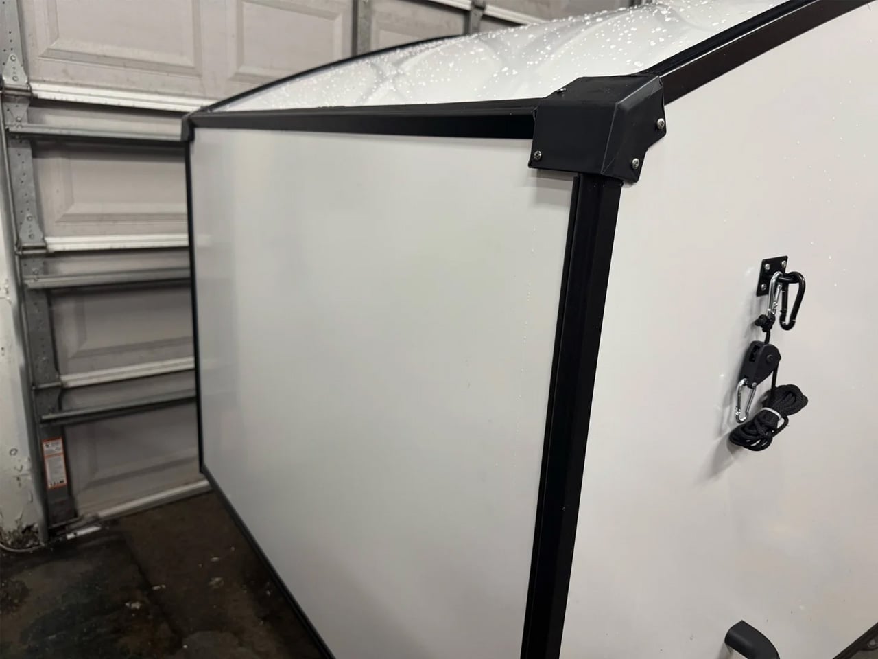 Crafted for utmost durability and maximum utility, the 48 inches wide x 6-foot 5 inches long Stubby may be bare bones on the inside to start with, but on the outside, it’s an impressive cabin. The rear access door, measuring 26 inches x 32 inches, is the only entrance. The periphery of the slide-in camper is marked by a set of 12-inch x 24-inch side windows that are strategically positioned to maximize natural light and ventilation. To ensure passive airflow, the Stubby also gets a half-moon air vent on either side. For an asking price of under $3,000, the Tiny Camper Company’s offering is surely enticing. Also, if you don’t like a lot of weight and side-protruding campers in your truck bed, the compact Stubby is a winner!