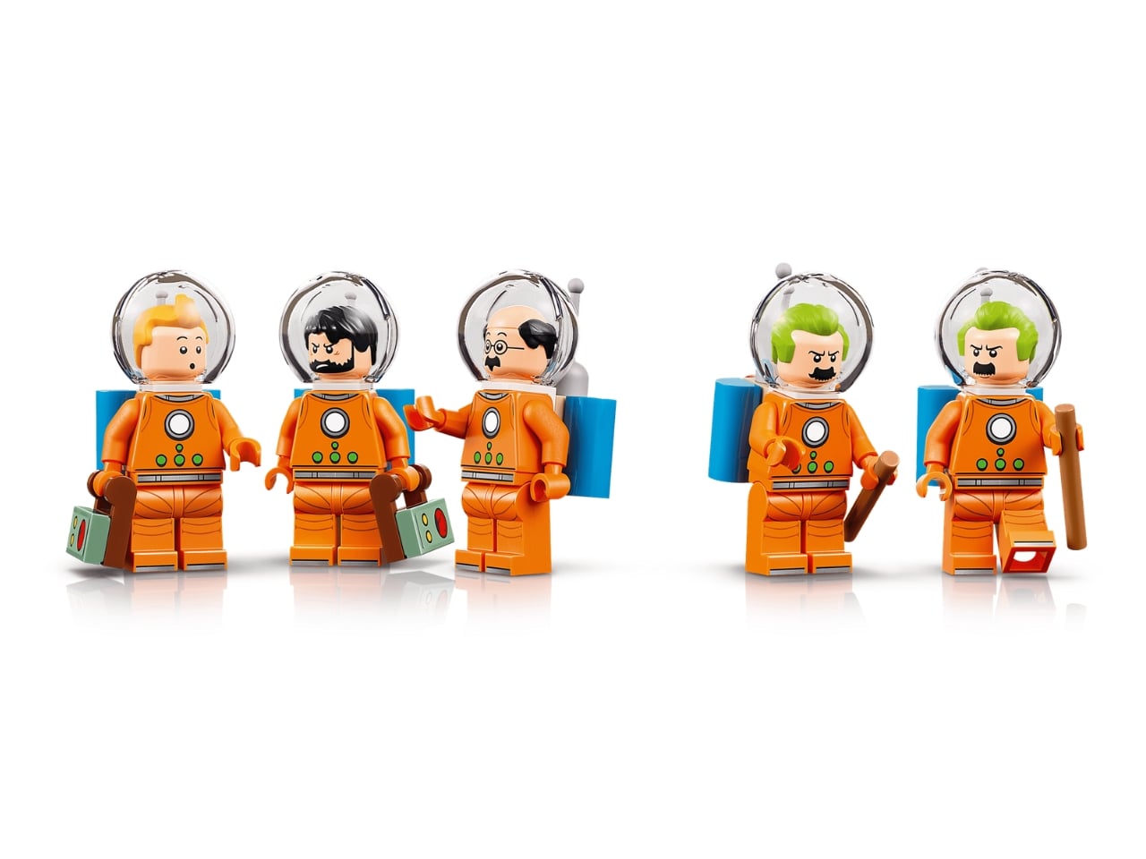 The set includes six figures, Tintin, Captain Haddock, Professor Calculus, the twin detectives Thomson and Thompson, all in detailed space suits with helmets and oxygen tanks, plus Snowy. There’s also a removable panel on the nose cone that opens to reveal a miniature control room inside. That’s the kind of considered detail that makes a $159 price tag feel reasonable rather than indulgent.