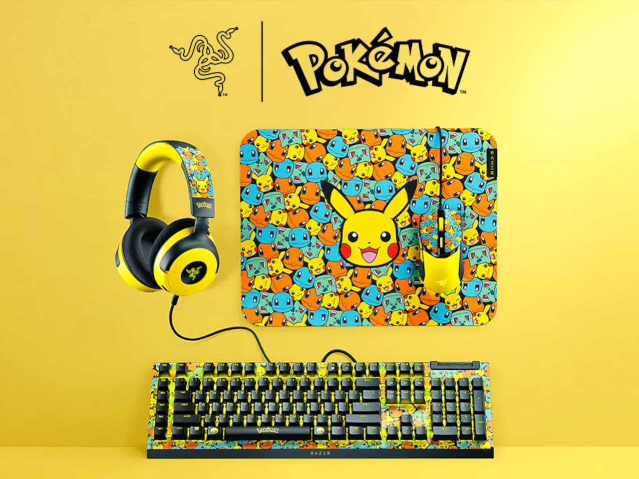 That is where Razer’s Pokémon collection comes in. Instead of one Pikachu mousepad, Razer built a full ecosystem that includes the BlackWidow V4 X keyboard, Cobra mouse, Kraken V4 X headset, and Gigantus V2 M mat. The line is officially licensed and leans into Kanto nostalgia, wrapping every peripheral in Pikachu, Bulbasaur, Charmander, and Squirtle graphics across bright yellow surfaces with synced Razer Chroma RGB lighting.