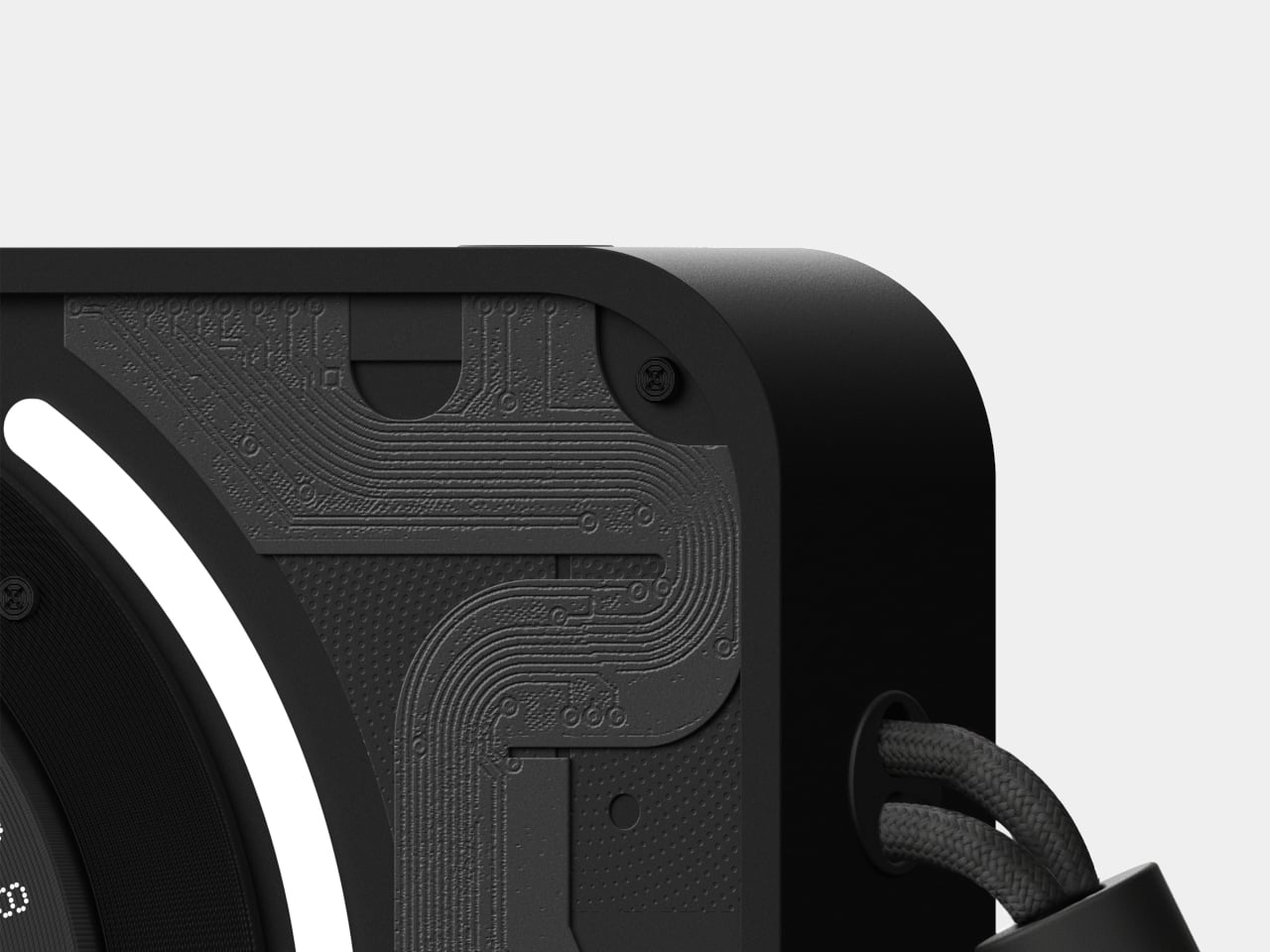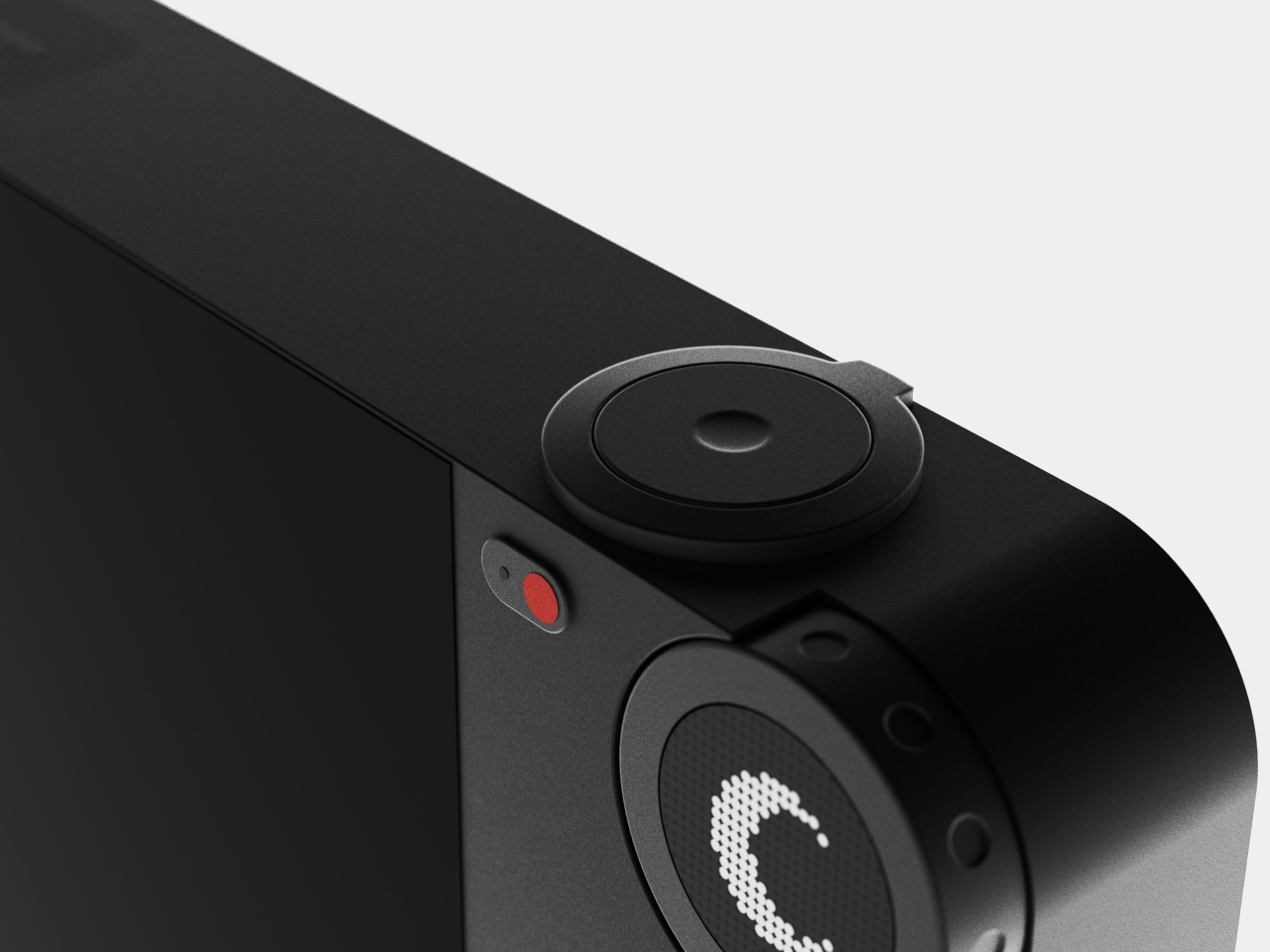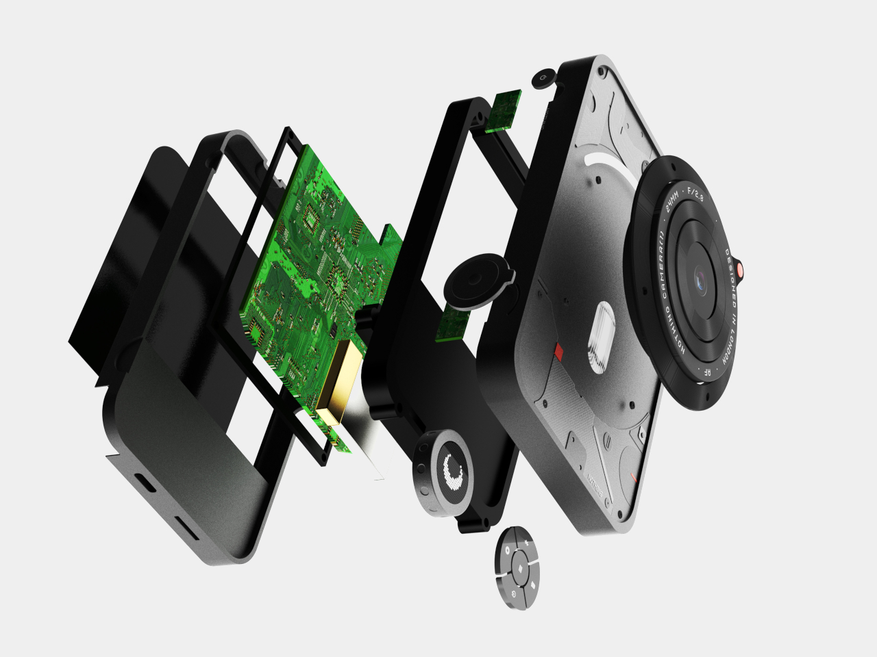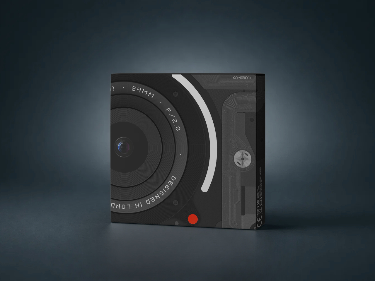The bead-blasted metal shell, the layered front panel with circuit-like relief, and the small red accents and screws give the camera a technical, almost transparent character without actually exposing its internals. It feels like a piece of hardware that is honest about how it works but still restrained enough to live on a café table or hang from a wrist strap without looking like it is trying too hard.