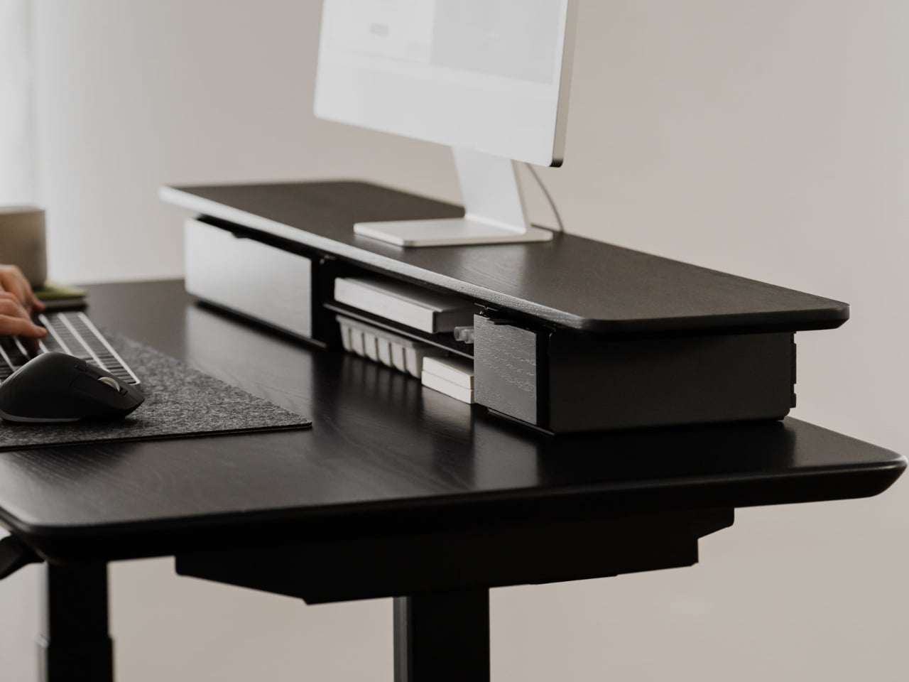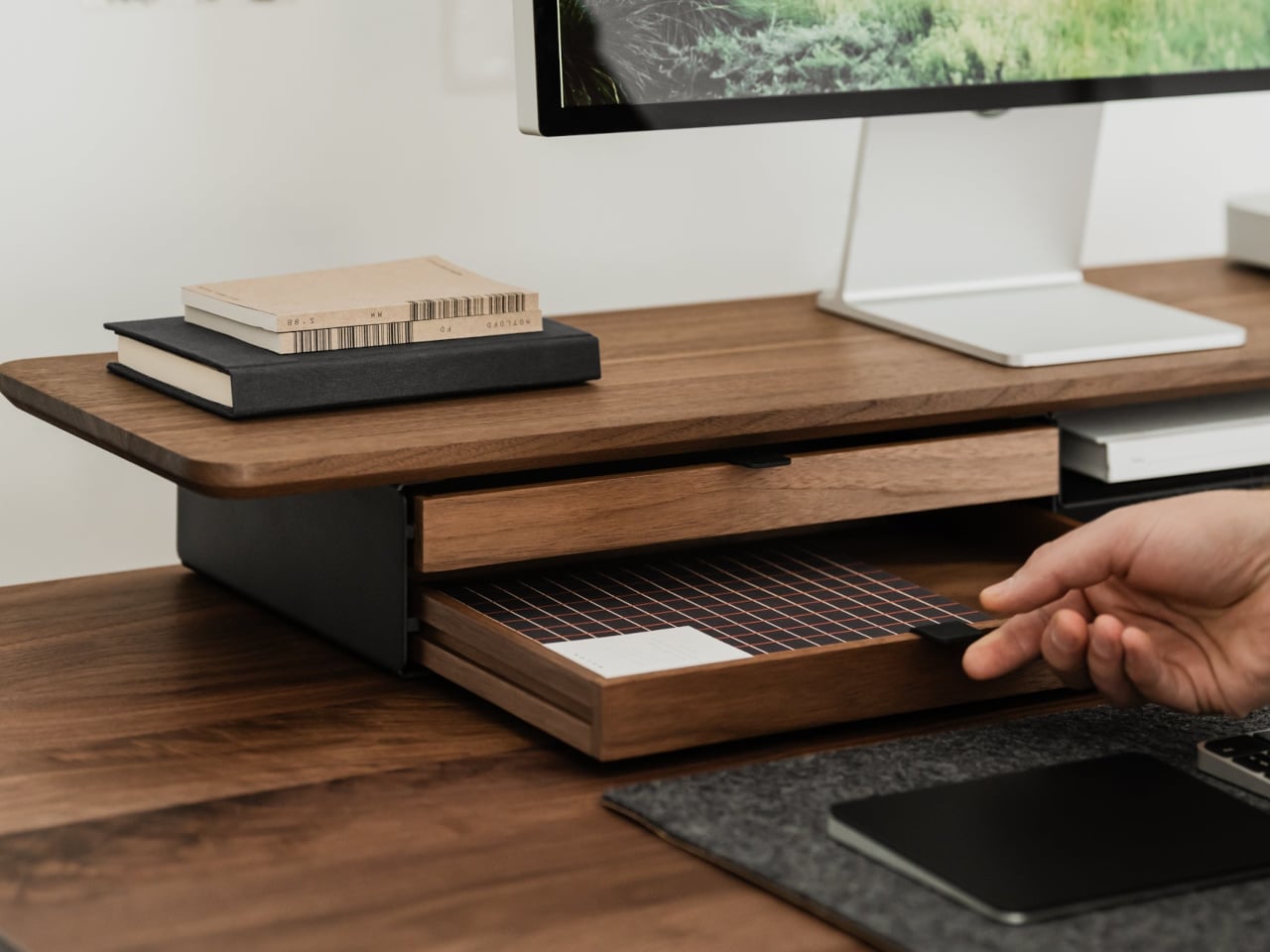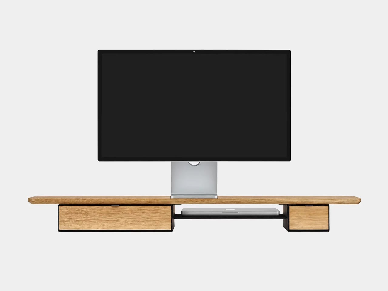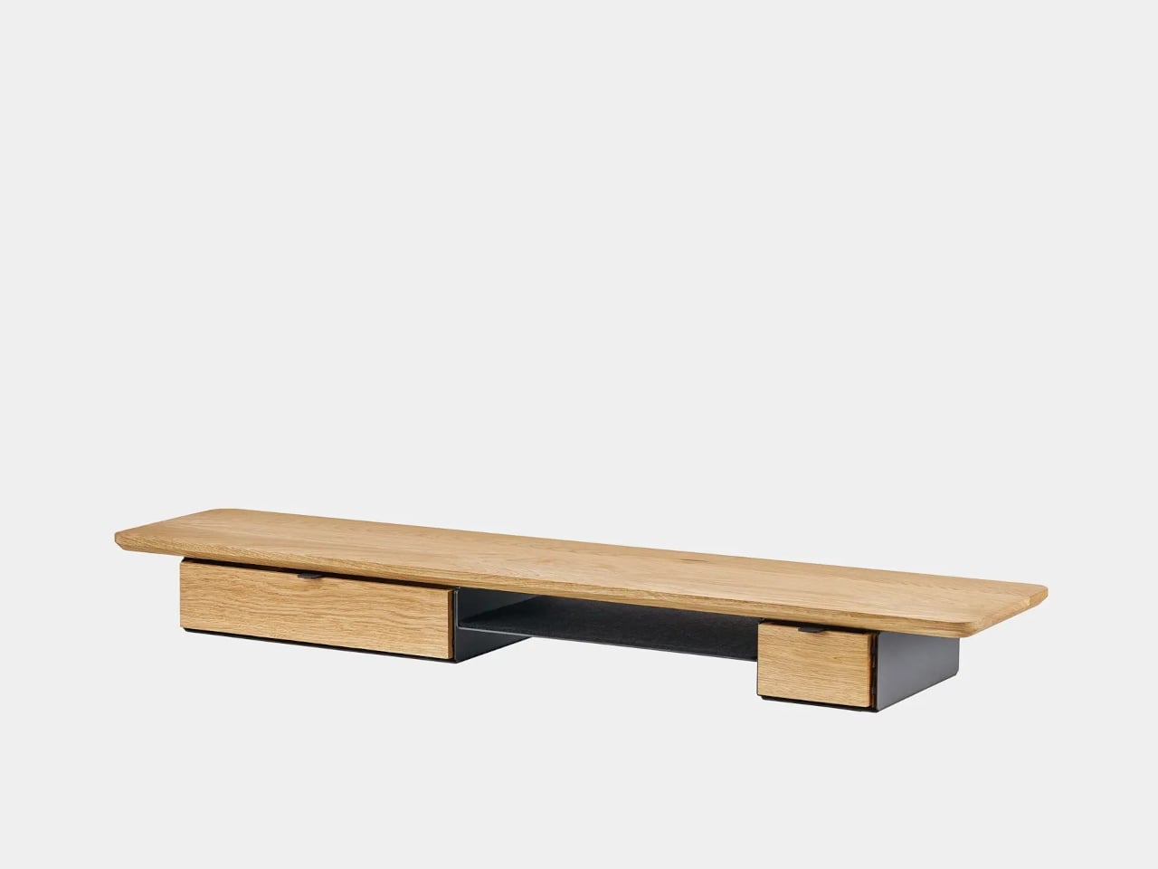 Desk Shelf Pro is an all-in-one desk shelf that lifts your monitor, hides clutter, and adds a second functional level to the workspace. It combines a long, rounded wooden platform with powder-coated steel legs, integrated drawers, and a felt-lined open shelf. It is built from solid oak or walnut, not MDF with a plastic skin, so it feels like part of the desk rather than something perched on top.