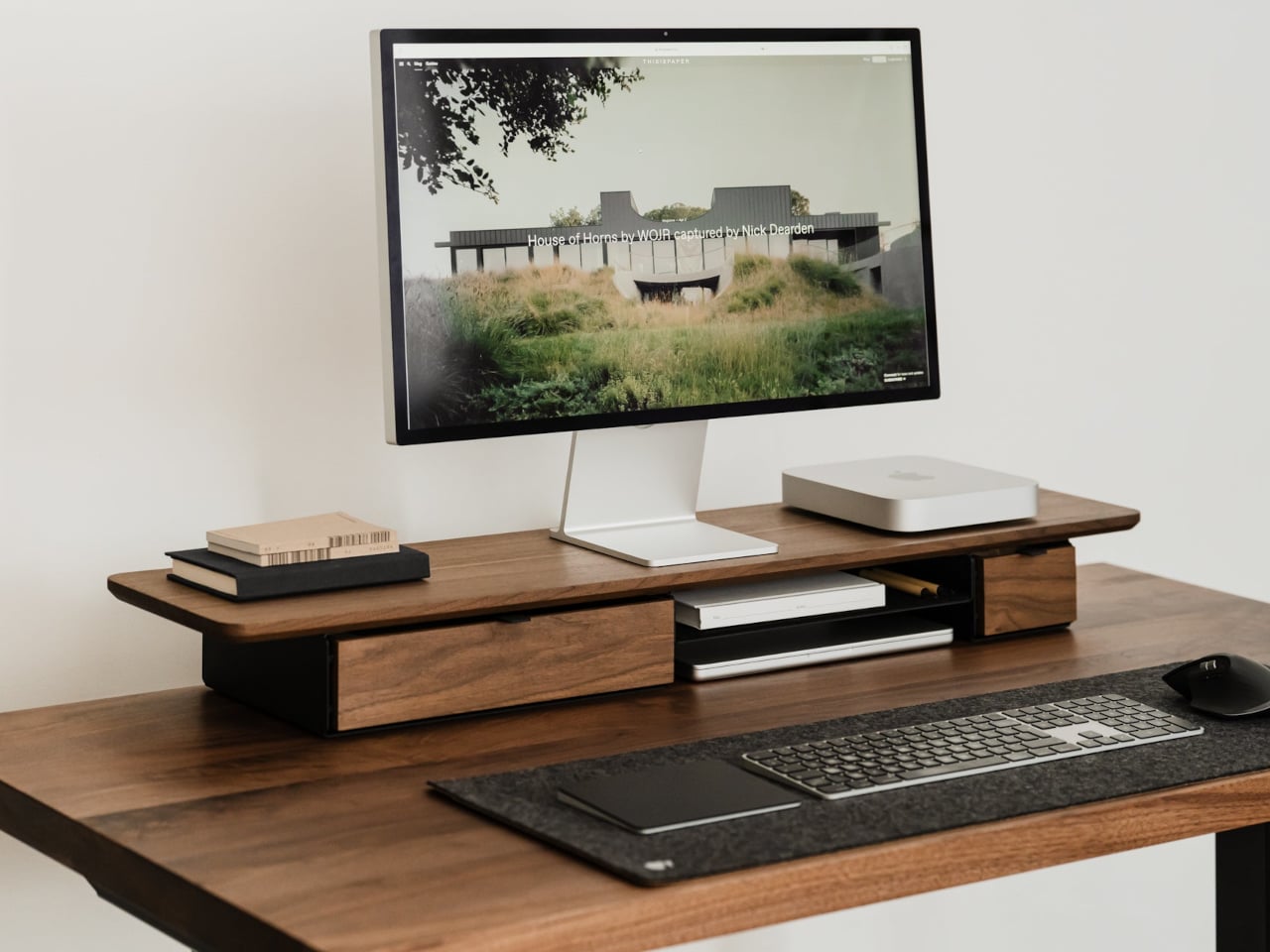 The shelf comes in oak for a lighter Scandinavian look, walnut for a richer studio vibe, or black-stained oak for a more dramatic setup. You can choose single or dual drawers depending on how much you like to hide, and black or white legs to match your hardware. It works equally well on a sit-stand desk or a fixed one, anchoring everything from a minimalist Mac setup to a more eclectic creative workstation.