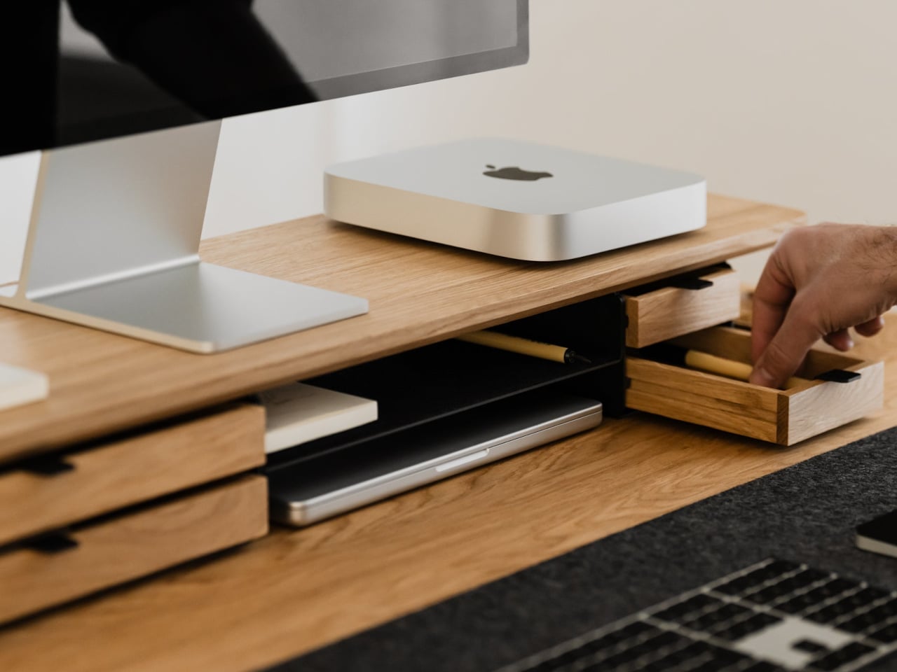 Storage splits between one or two solid-wood drawers built into the leg modules and an open shelf running between them. The drawers swallow stationery, notebooks, and small tech, keeping the desktop clear. The open shelf is lined with merino wool felt, which protects tablets, trackpads, or a closed laptop from scratches and adds a soft, tactile layer that contrasts with the wood and steel.
