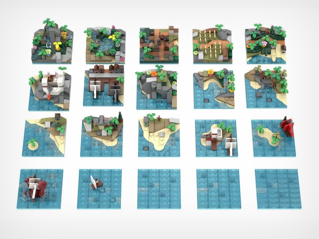 Start mixing configurations and the mathematics get wild. A 4×5 grid holding 20 tiles produces absurd permutation counts even accounting for corner and edge restrictions. You could theme it with all land tiles clustered on one side creating an archipelago. You could scatter islands randomly across mostly-water fields. You could jam civilization into one corner and leave wilderness sprawling everywhere else. The modularity isn’t decorative flexibility. It’s the entire reason this concept works as a product rather than just a pretty render.